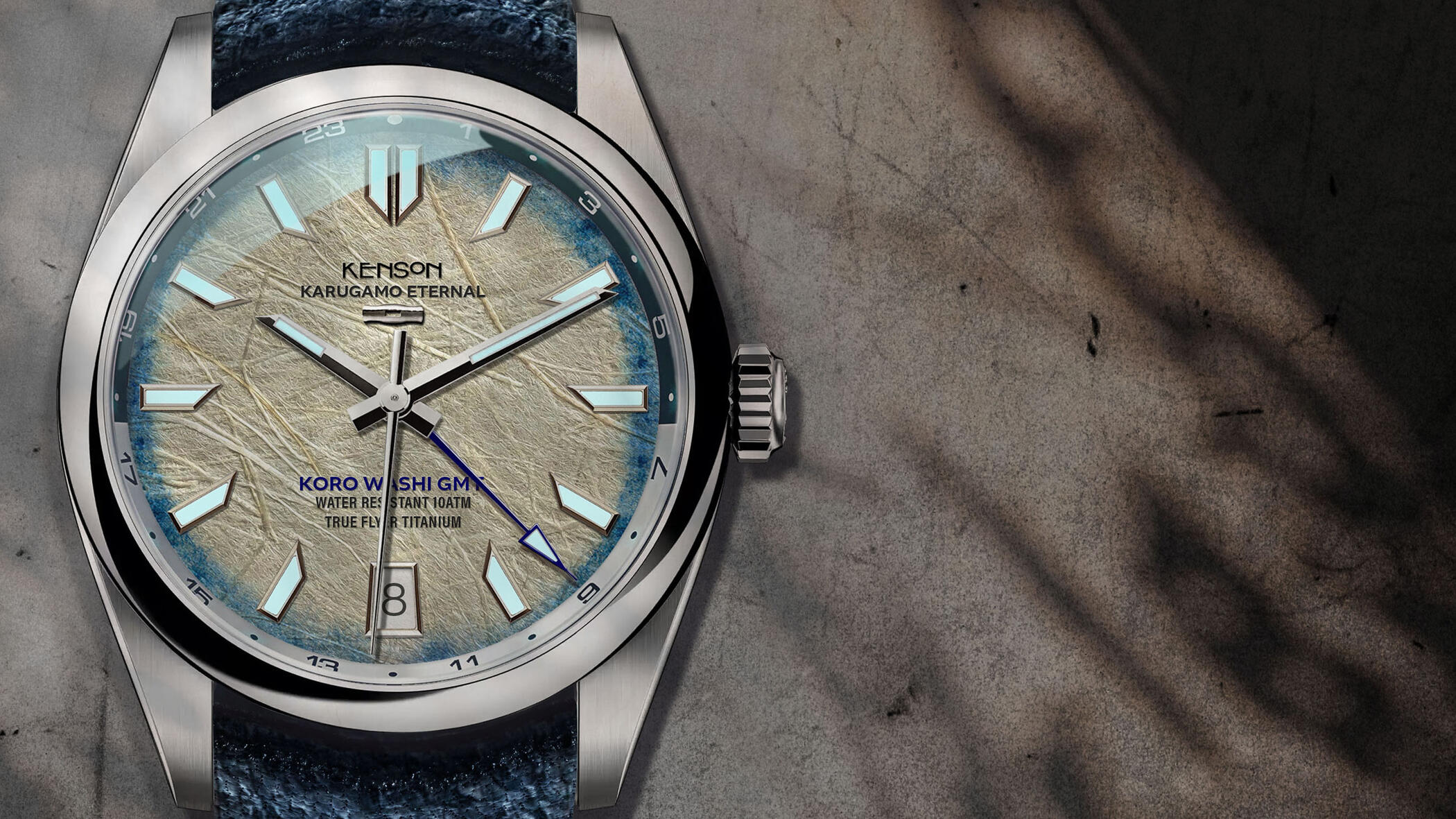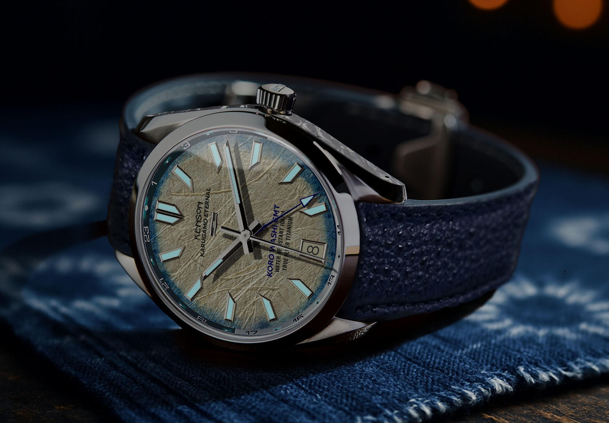 Every surface of a Kenson watch reflects a choice; not for attention, but for integrity.The flanks are tsuchime-finished, a traditional hammering once used to harden steel. Recreated from a forged original, it is precision-milled into hardened titanium. A quiet texture, visible only from the side.The dial evokes washi paper; a metaphor. Fibers layered like memory, printed with depth and finished to capture shifting light.Even the strap speaks in a whisper: hand-cut Himeji leather, vegetable tanned and indigo dyed. Prized for centuries not because it stood out, but because it endured.